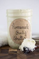 In a glass 2 cup measure, add ¼ cup coconut oil, ¼ cup olive oil, ¼ cup cocoa or shea butter and a few drops of essential oil for fragrance. Melt slowly in the microwave, stirring frequently until well blended. Pour into a clean storage container. The liquid will harden to the texture of butter fresh from the fridge. To apply, warm a little in your hand until liquid again.
